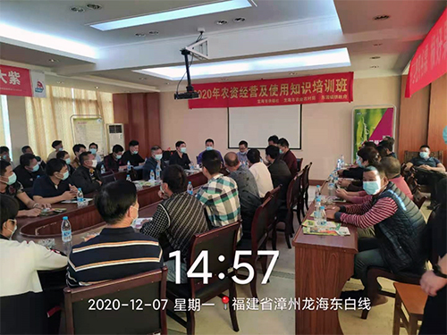 为规范种植户合理使用农资产品,进一步加强农业科技服务,从12月4日开始,龙海市农业农村局、供销社以及漳州龙鑫农资公司组织开展了2020年农资经营及使用知识培训班,特别邀请我公司技术专家王老师参加技术培训。