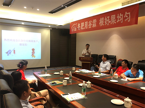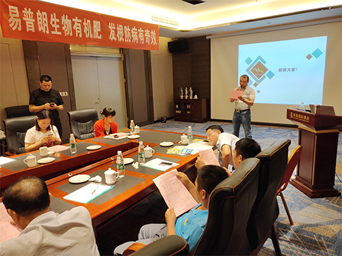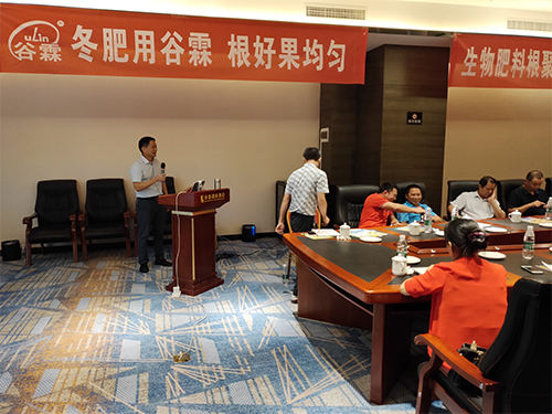 会议正式开始,众邦农业朱总致欢迎词,欢迎各乡镇客户的到来,然后由我公司王总介绍了赣南脐橙生理特性及施肥技术,并就“谷霖”“易普朗”生物有机肥的特点及在脐橙果树使用的表现。并介绍了我公司产品“富镁”生物有机肥,此产品特别添加镁元素,对赣南脐橙缺镁黄化有很好的改善作用。