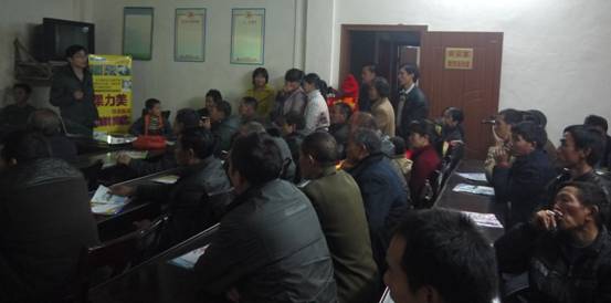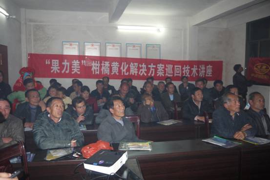 1月21日晚8点,本次巡回讲座的第一站在长安村开展,全村60多位果农参加了本次技术讲座。在会议过程中,由江西办章熊讲解谷霖生物有机肥的技术知识,由江西办赖海平向大家讲解果力美的技术原理与柑橘黄化的解决方法。谷霖生根防病,肥药一体的特点引起广大果农的强烈共鸣,部分使用过谷霖的果农主动分享经验;果力美针对解决柑橘叶片黄化的显著效果在会议现场引起了广大农民的激烈讨论,纷纷在会议现场表示一定试用果力美。会议的最后,许多果农在现场就认购了我公司的产品。由于广大果农热烈响应,大胆发言讨论,会议一直进行到晚上11时才结束,并且表示非常希望我公司继续推广宣传优良的科学技术。