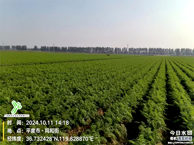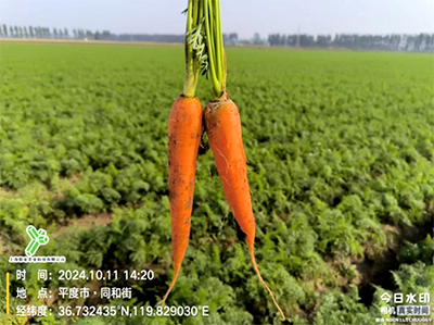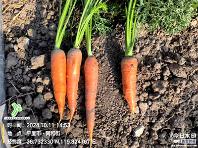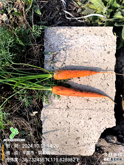 使用效果:胡萝卜整体长势较旺,根系发达,明显刺激各级根系的发生和伸长,增大根系的吸收面积和吸收强度。对比未使用区域,胡萝卜根部形状规则漂亮,颜色偏深偏红,根部无分叉,整体品质较好。