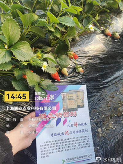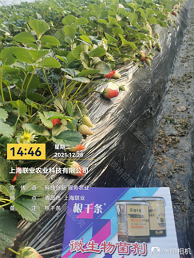 农户使用根千条回访使用效果,草莓冲施后叶片厚绿、结果量大